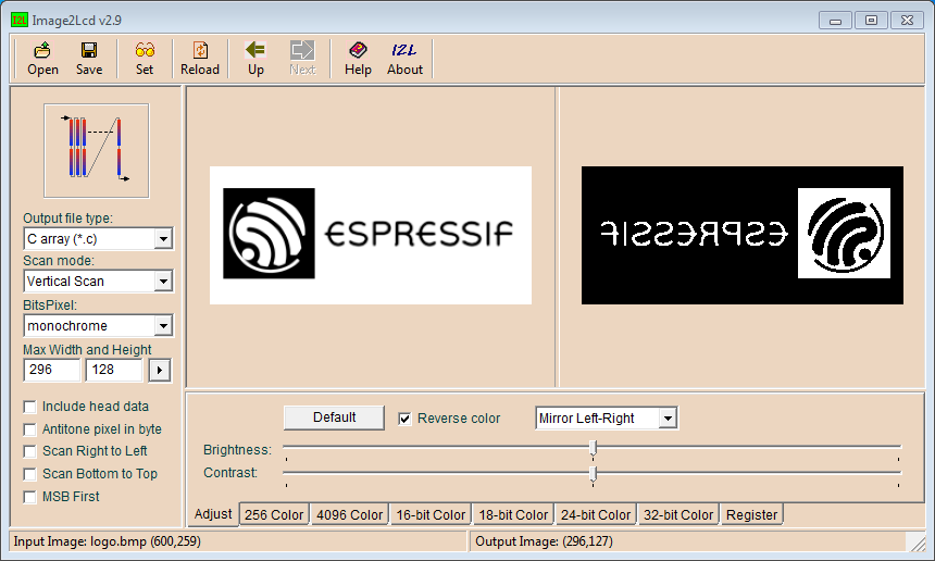 To convert an exiting image to the C header file, use an application recommended by Waveshare in their Wiki. See a picture below what parameters to set. I have discovered that you need to mirror the image and this was not documented in the Wiki.