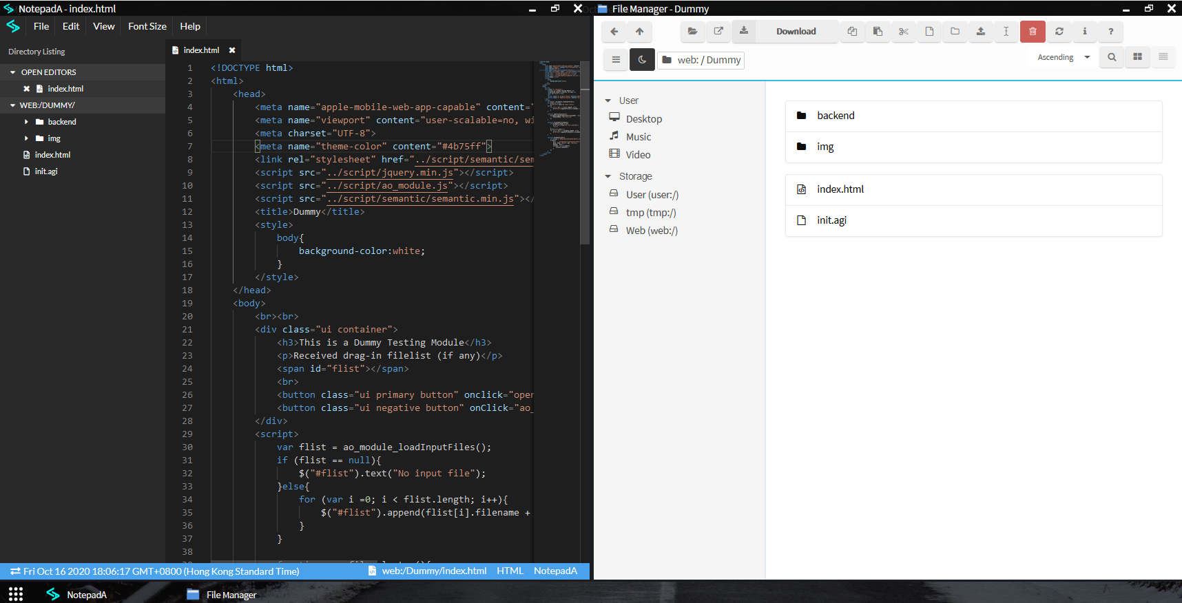 The ArOZ AJGI / AGI interface provide a javascript programmable interface for ArOZ Online users to create plugin for the system. To initiate the module, you can place a "init.agi" file in the web directory of the module (also named the module root). See more details in the AJGI Documentation.