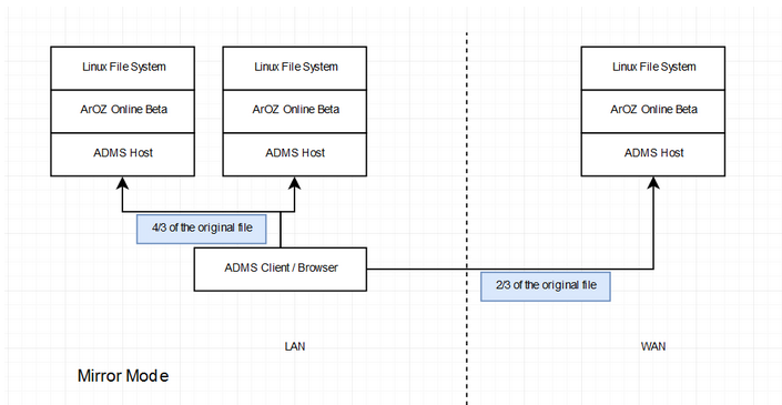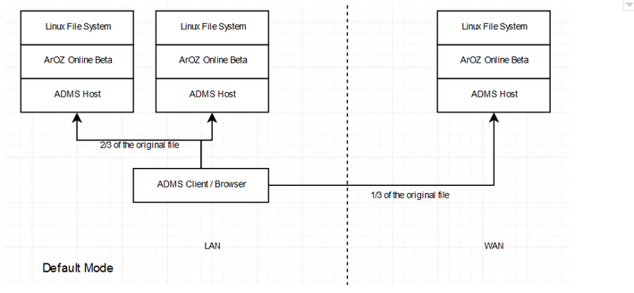 During upload, files are split into a number of 4MB chunks of file and uploaded to ADCS host with Round Robin Algorithm within the same LAN (default) or chosen from a list of predefined host list stored on the host system and mirrored from and within the LAN. File will be splitted and stored on multiple servers, or duplicate over multiple servers if the preset is set to Mirror (2 copies of each Chunk), Kaleido (3 copies of each chunk).